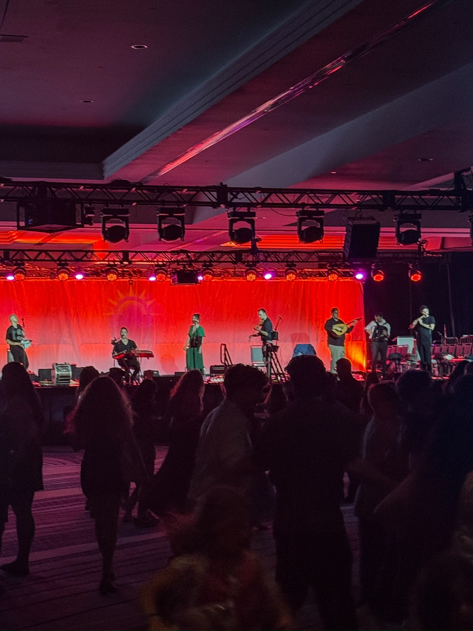 A lively crowd dancing under vibrant red stage lights with band members passionately playing instruments.